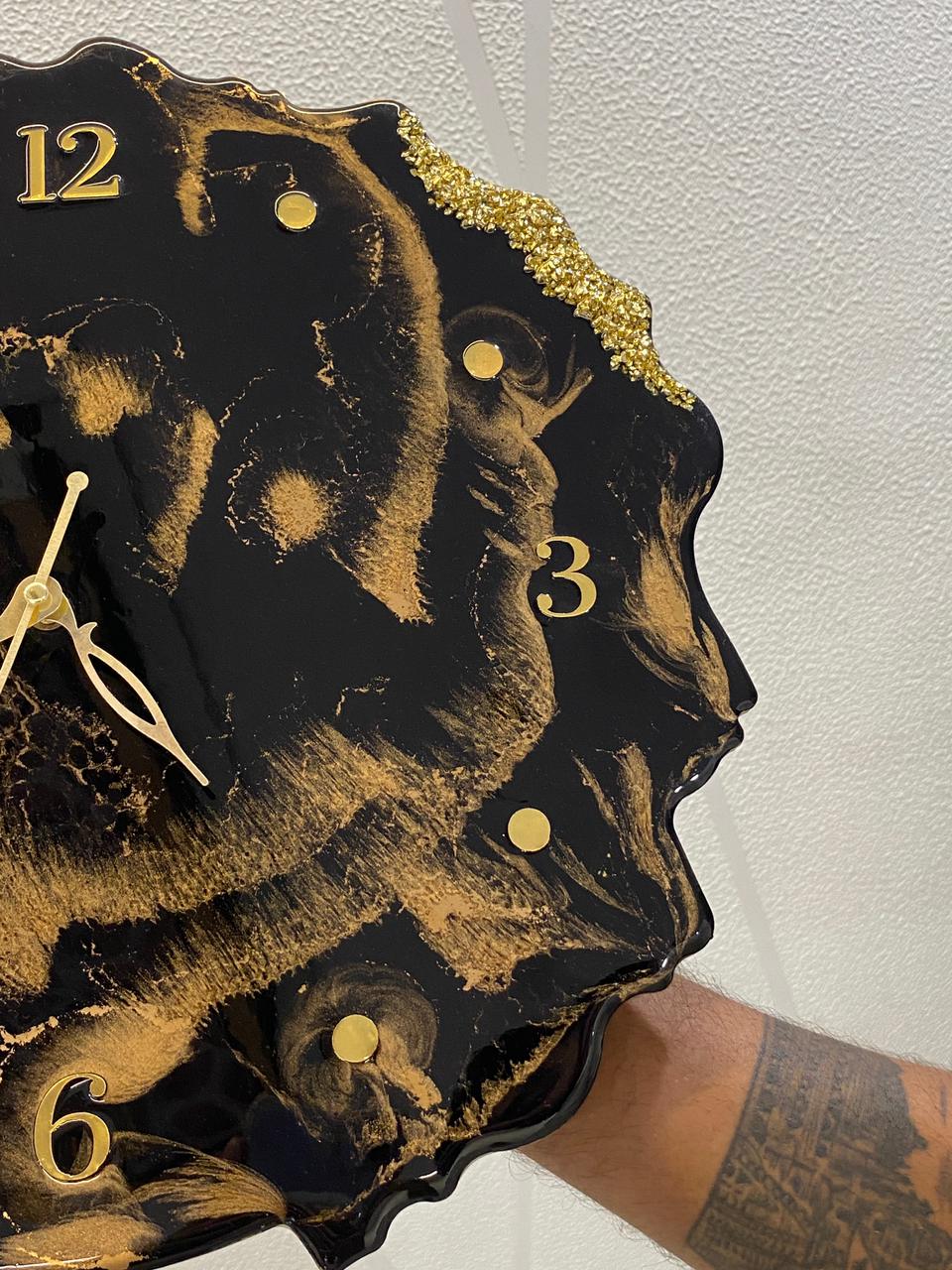 Upgrade your space with this stunning 12 inch Black & Gold Resin Wall Clock, a perfect blend of luxury and modern art. This handmade designer clock features an elegant black base with rich golden abstract detailing, giving a premium marble effect look. The golden numbers and stylish hands enhance its royal appearance, making it a statement piece for any wall.