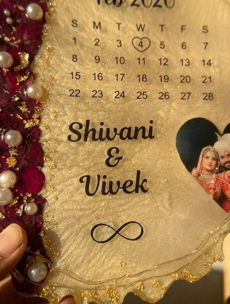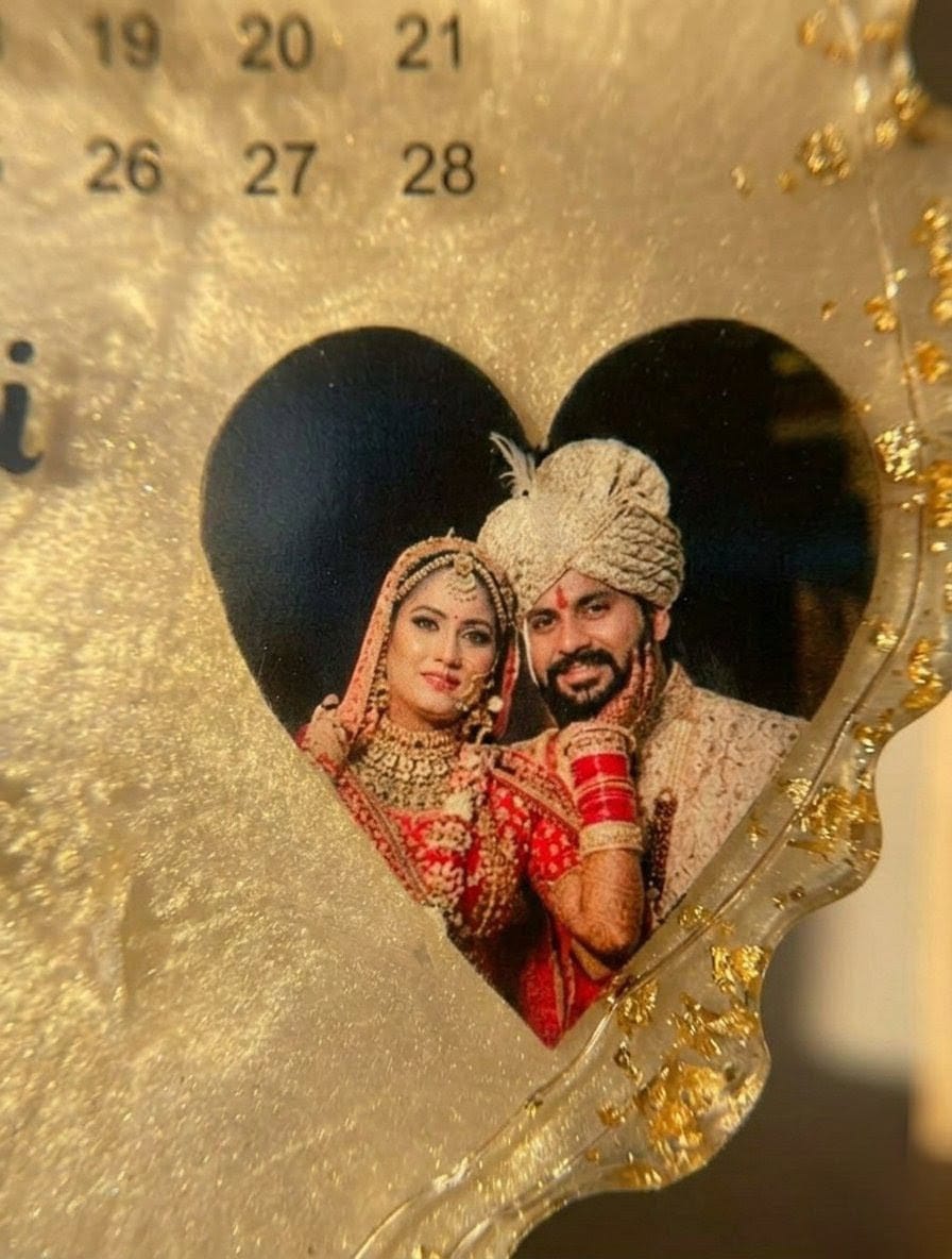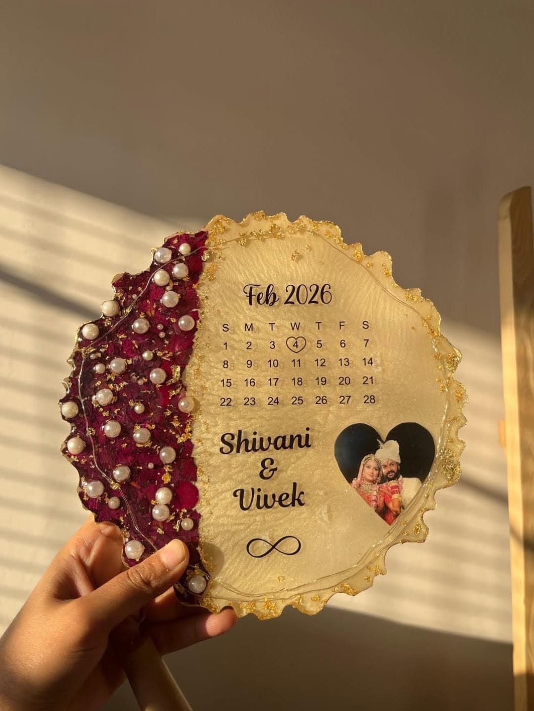 This beautifully handcrafted resin calendar frame is designed to celebrate your most important day in a unique and elegant way. With a luxurious glossy finish, real dried flowers, pearls, and gold detailing, it adds a premium touch to your love story.